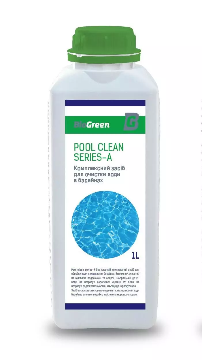 Pool clean series-A, це без хлорний універсальний рідкий засіб для комплексної обробки води в плавальних басейнах. Безпечний для дітей не викликає подразнень та алергії. Нейтральний до РН. Безпечний для людей та тварин. Не має подразливої дії на органи дихання. Не подразнює слизову оболонку та шкіру. Не утворює у воді та повітрі токсичні сполуки. Не викликає корозії металів та руйнування інших поверхень. Безпечний при обслуговуванні басейнів.