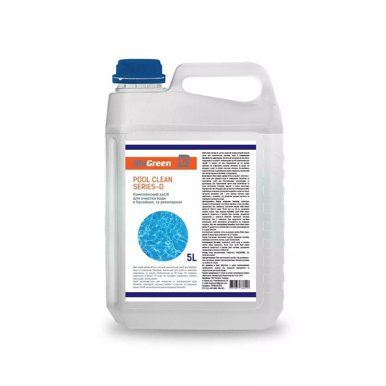 Pool clean series-D, це без хлорний універсальний рідкий засіб для комплексної обробки води в плавальних басейнах та аквапарках. Безпечний для дітей не викликає подразнень та алергії. Нейтральний до РН. Безпечний для людей та тварин. Не має подразливої дії на органи дихання. Не подразнює слизову оболонку та шкіру. Не утворює у воді та повітрі токсичні сполуки. Не викликає корозії металів та руйнування інших поверхонь. Безпечний при обслуговуванні басейнів та аквапарків.