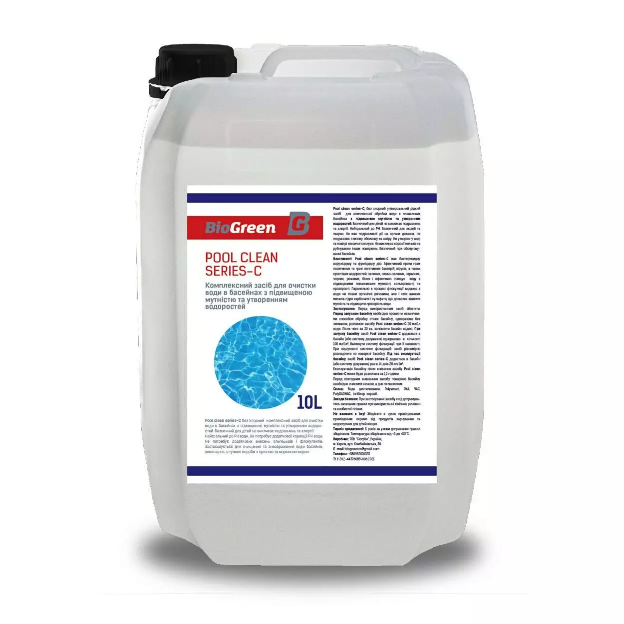 Pool clean series-C без хлорний універсальний рідкий засіб для комплексної обробки води в плавальних басейнах з підвищеною мутністю та утворенням водоростей. Безпечний для дітей не викликає подразнень та алергії. Нейтральний до РН. Безпечний для людей та тварин. Не має подразливої дії на органи дихання. Не подразнює слизову оболонку та шкіру. Не утворює у воді та повітрі токсичні сполуки. Не викликає корозії металів та руйнування інших поверхень. Безпечний при обслуговуванні басейнів.