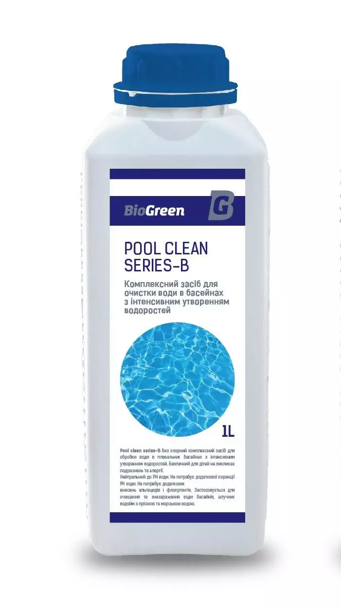 Pool clean series-В, без хлорний універсальний рідкий засіб для комплексної обробки води в плавальних басейнах з інтенсивним утворенням водоростей. Безпечний для дітей не викликає подразнень та алергії. Нейтральний до РН. Безпечний для людей та тварин. Не має подразливої дії на органи дихання. Не подразнює слизову оболонку та шкіру. Не утворює у воді та повітрі токсичні сполуки. Не викликає корозії металів та руйнування інших поверхень. Безпечний при обслуговуванні басейнів.
