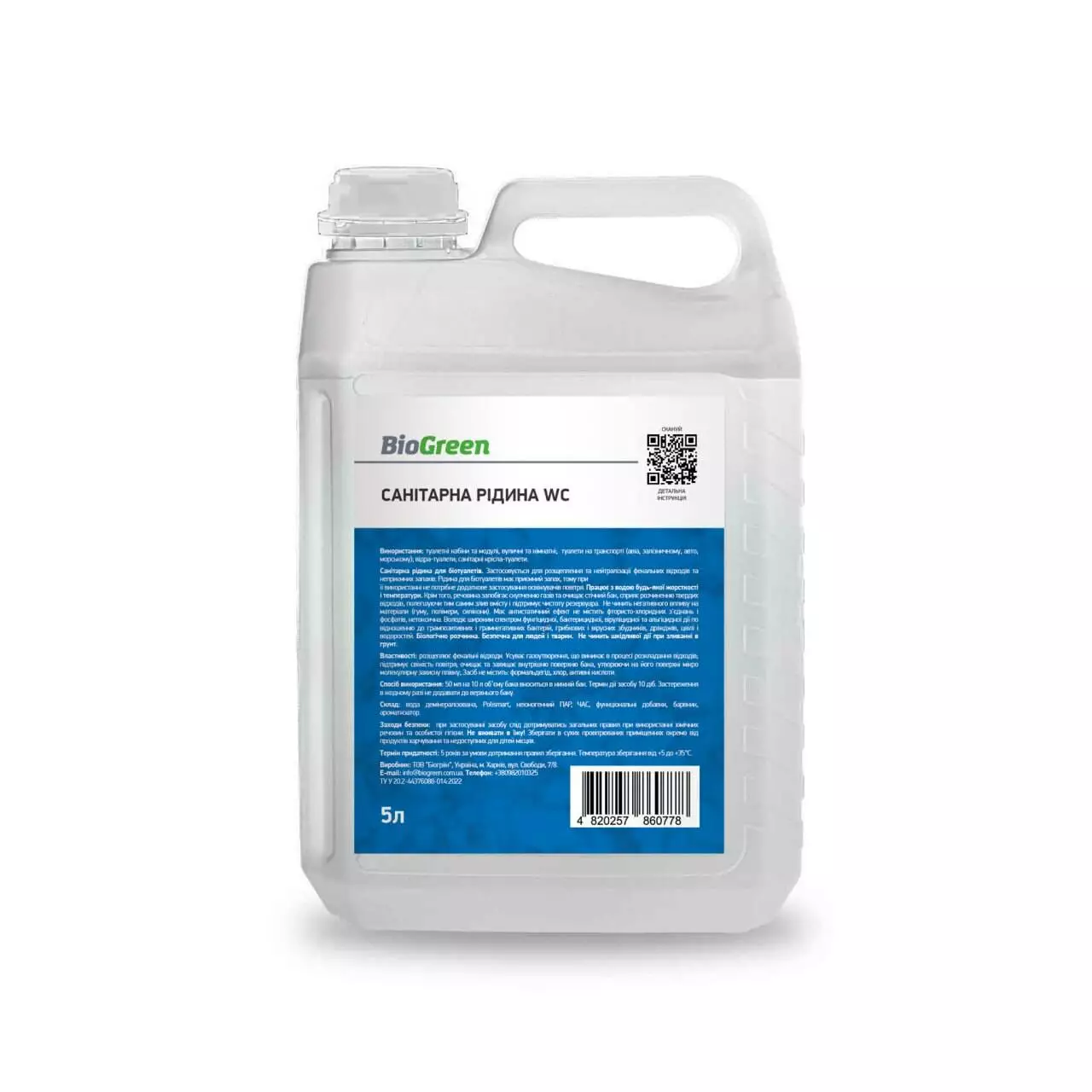 Санітарна рідина для туалетних кабін, транспорту та санітарних пристроїв BioGreen WC 5л